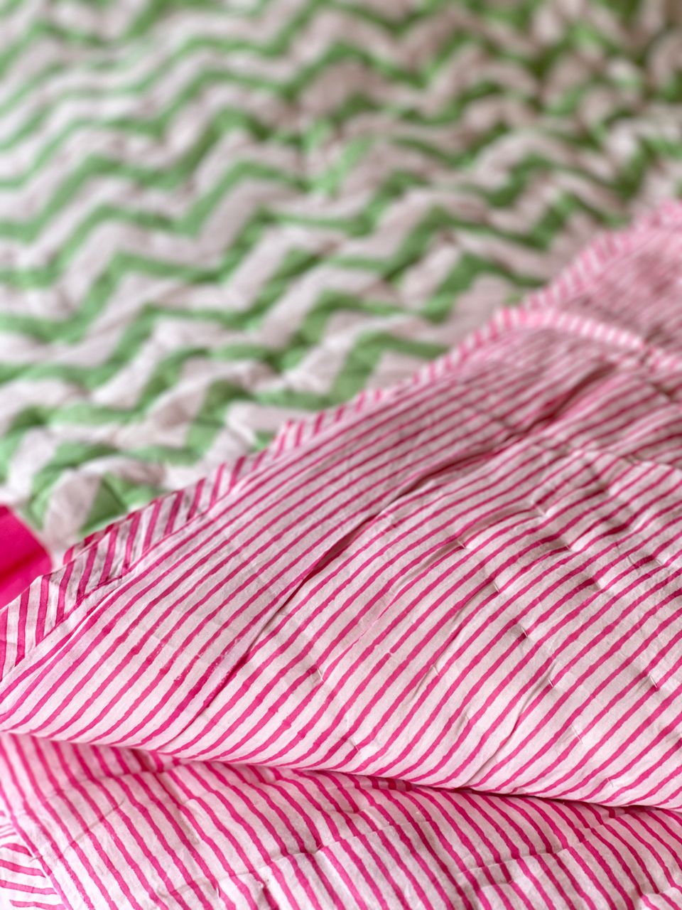 100% Cotton - Green & White Zig Zag on one side - Pink & White Slim Stripe on the other...