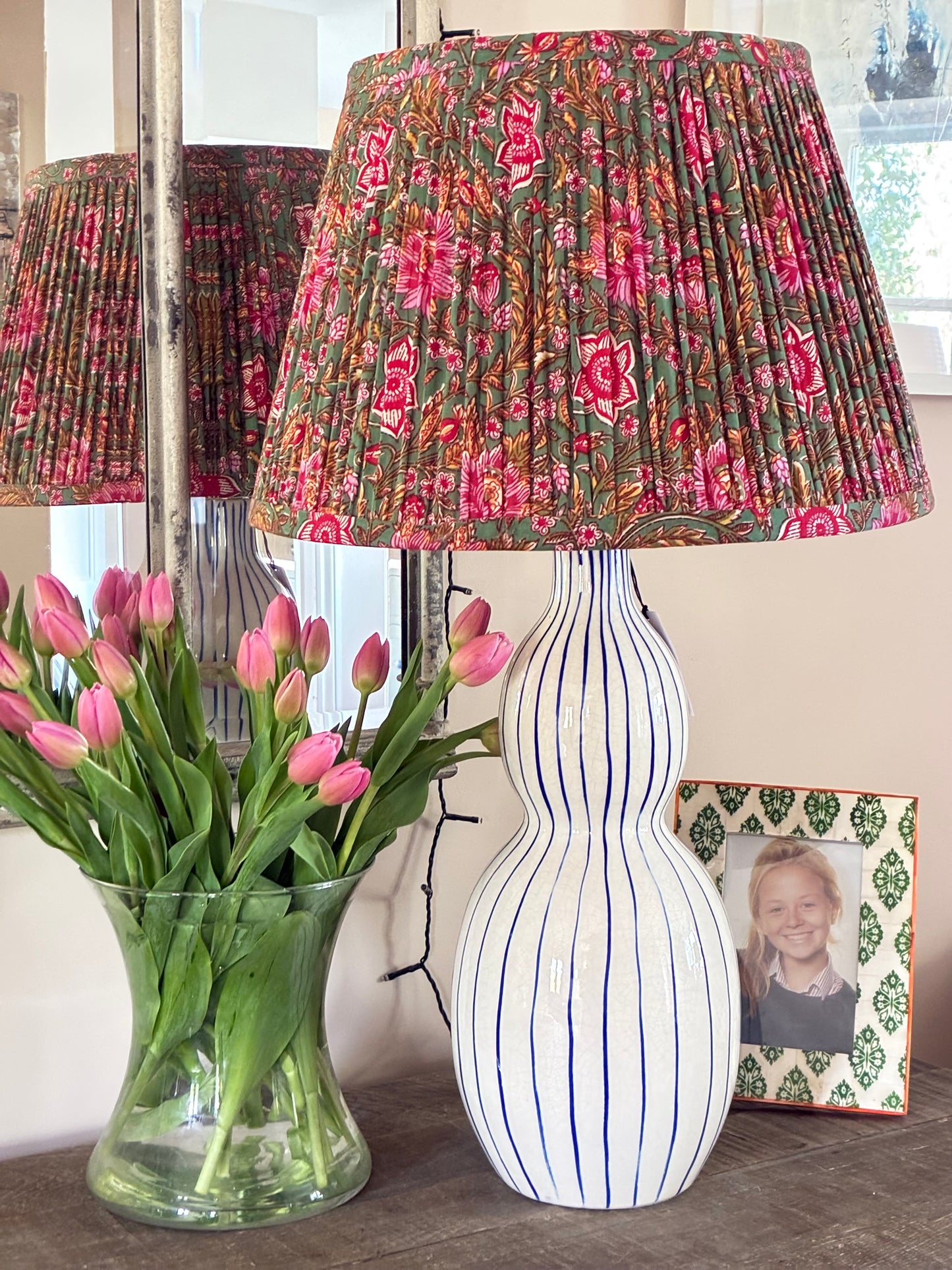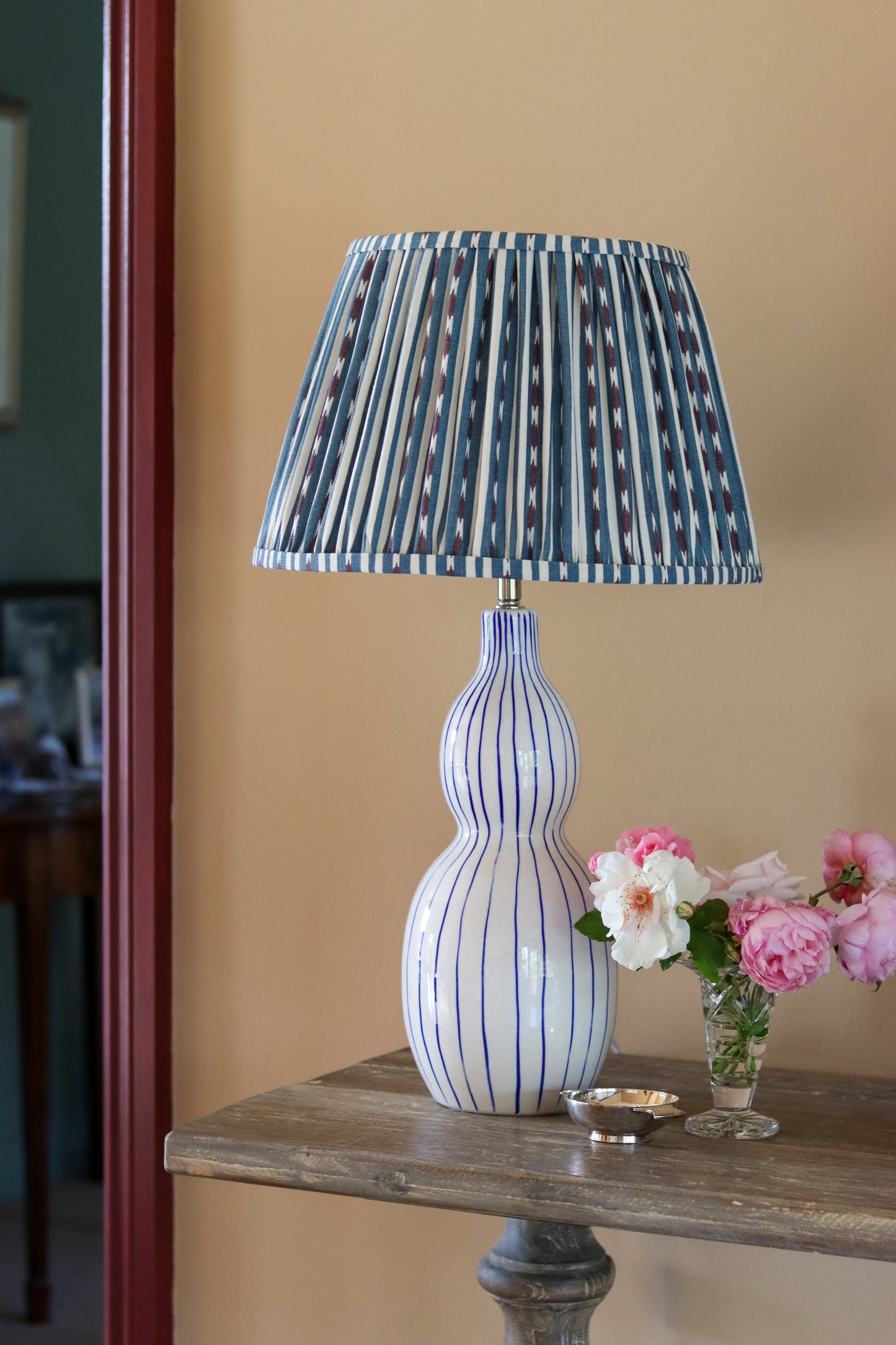 The Gavisa Table Lamp is a stylish and unique addition to your home. It is hand painted with elegant blue stripes and comes with a cream linen lampshade